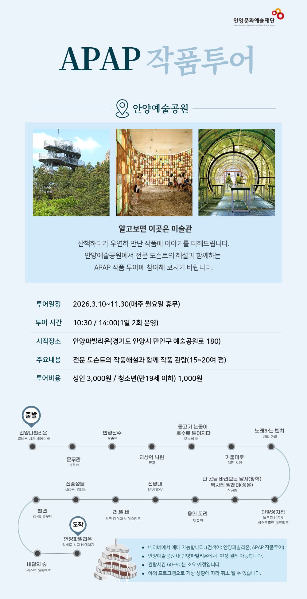 APAP 전문도슨트(작품해설사)와 함께 안양예술공원의 아름다운 숲과 하천을 따라 걸으며 안양공공예술프로젝트를 통해 설치된 공공예술작품 15~20여 점을 감상하는 프로그램 입니다.