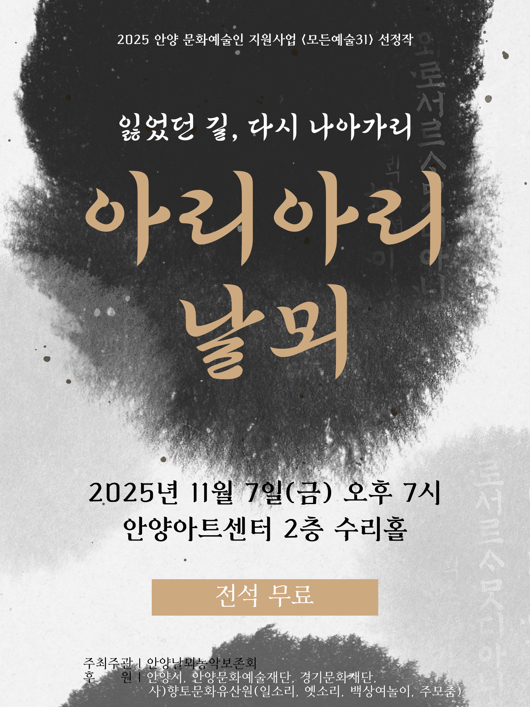 • 공연 안내 : 안양날뫼농악보존회 <아리아리 날뫼> • 공연 일시 : 2025년 11월 07일(금) 오후 7시 • 공연 장소 : 안양아트센터 수리홀 • 관람 연령 : 전체 관람가 • 티켓 가격 : 전석 무료(현장 예매) • 문의 : 010-2676-9049