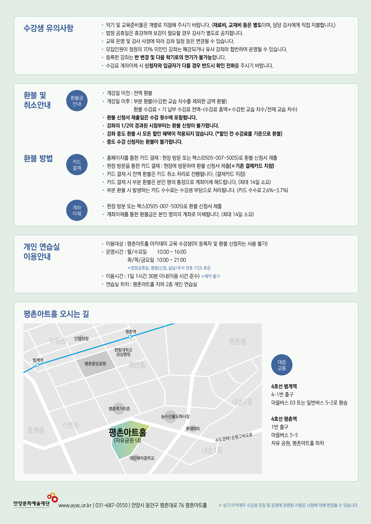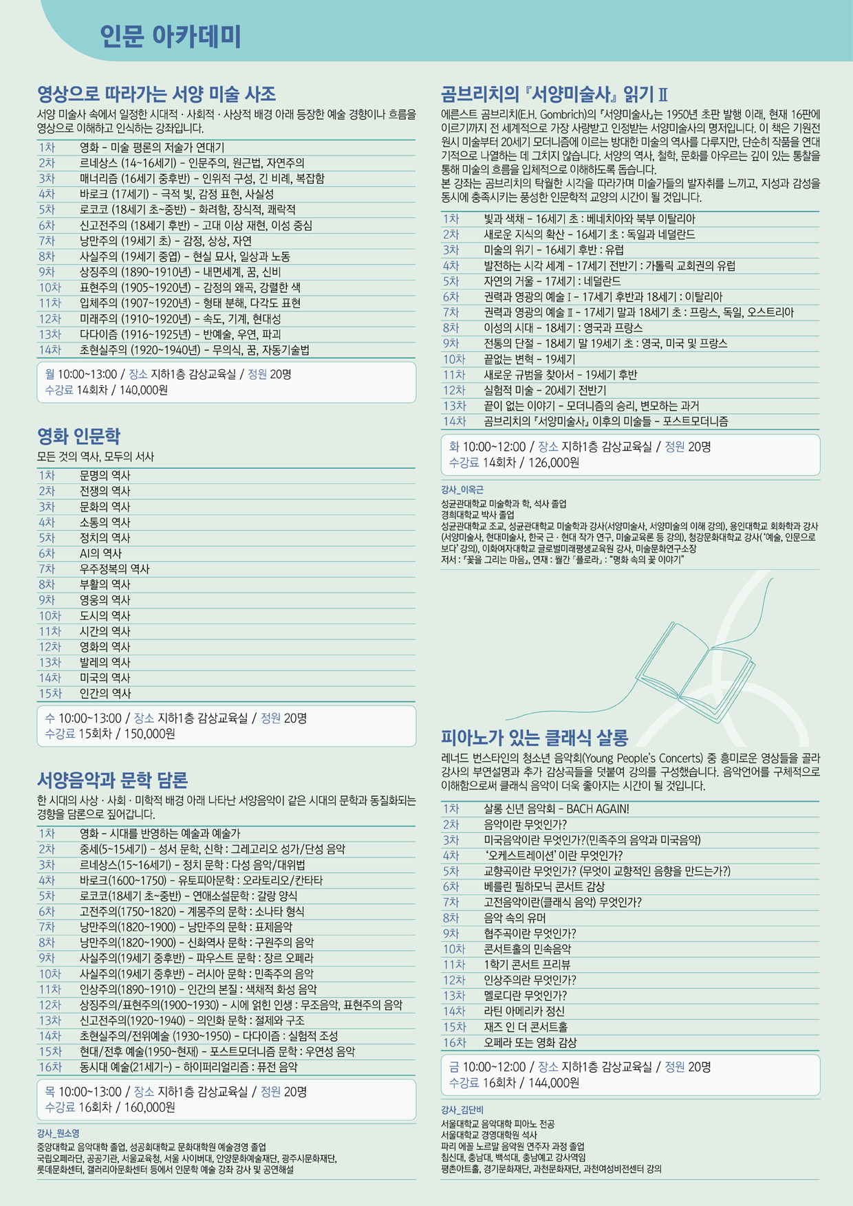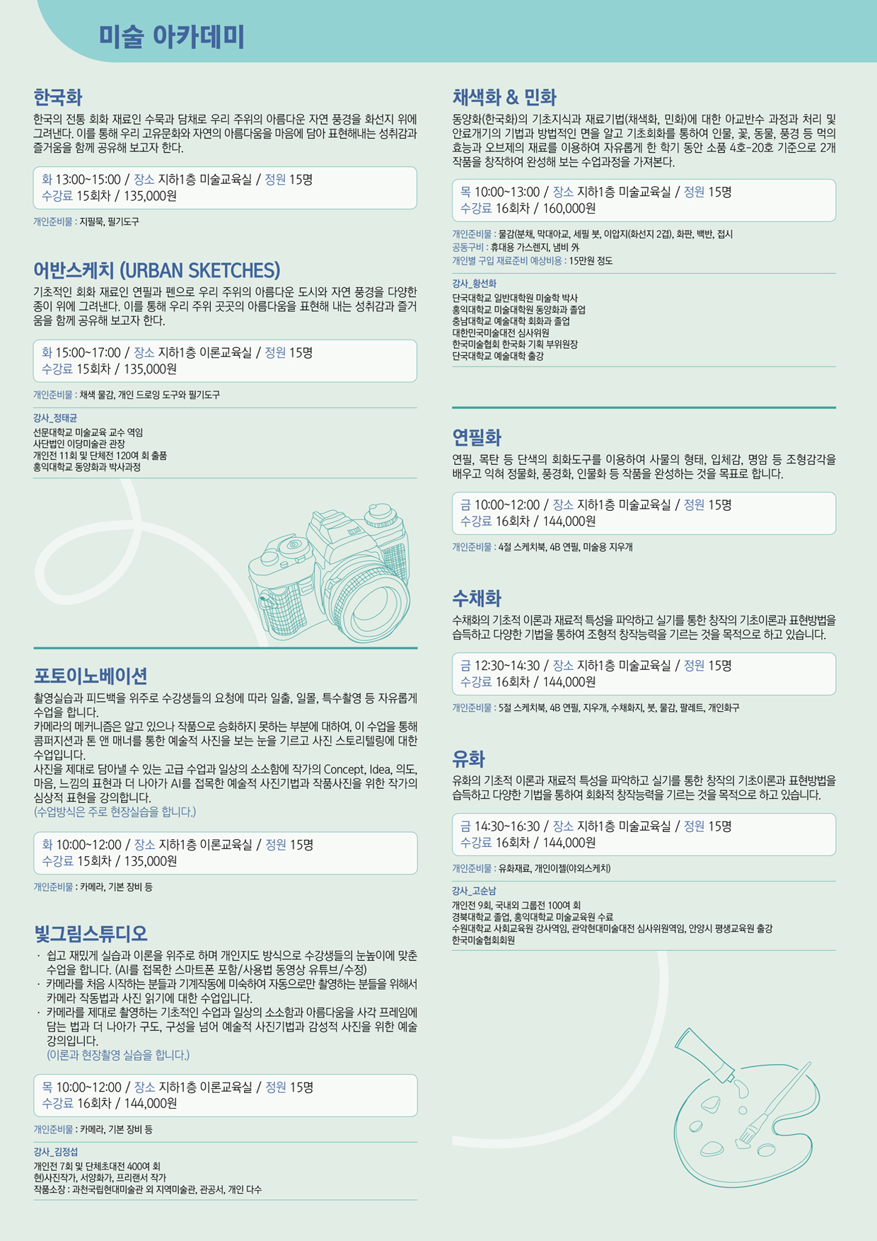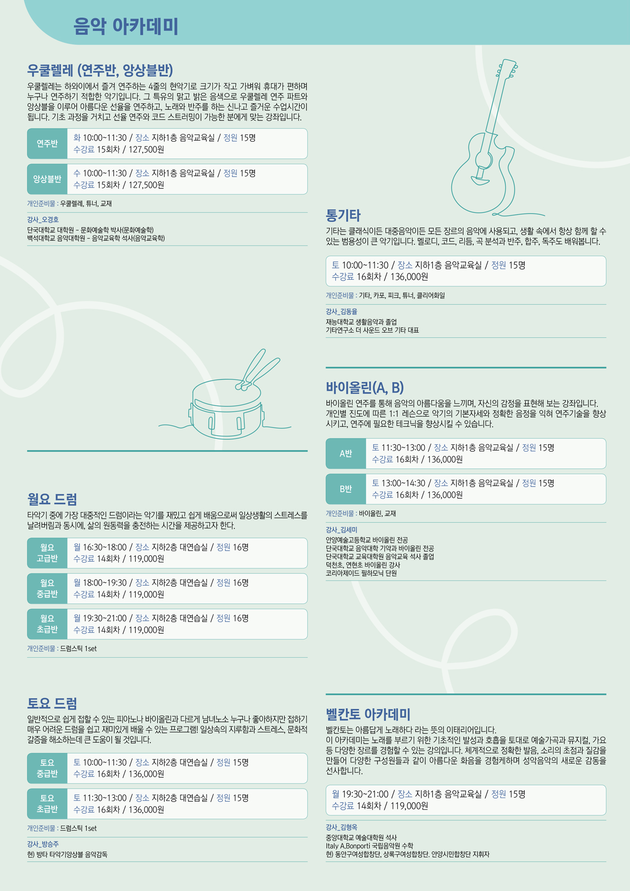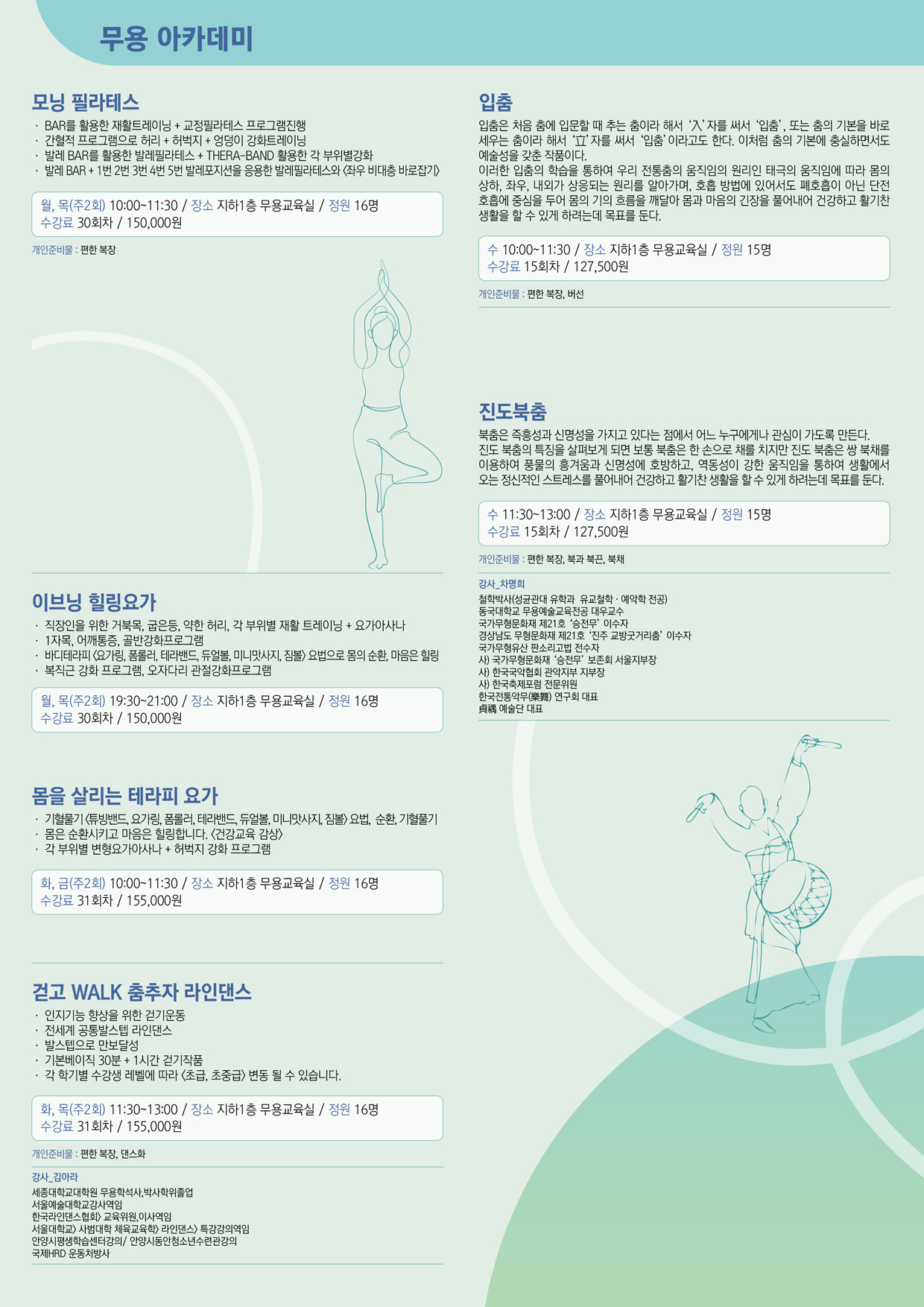 * 요일마다 장르별로 동시 접수 및 선착순 마감으로 상세일정 확인 해주시기 바랍니다.