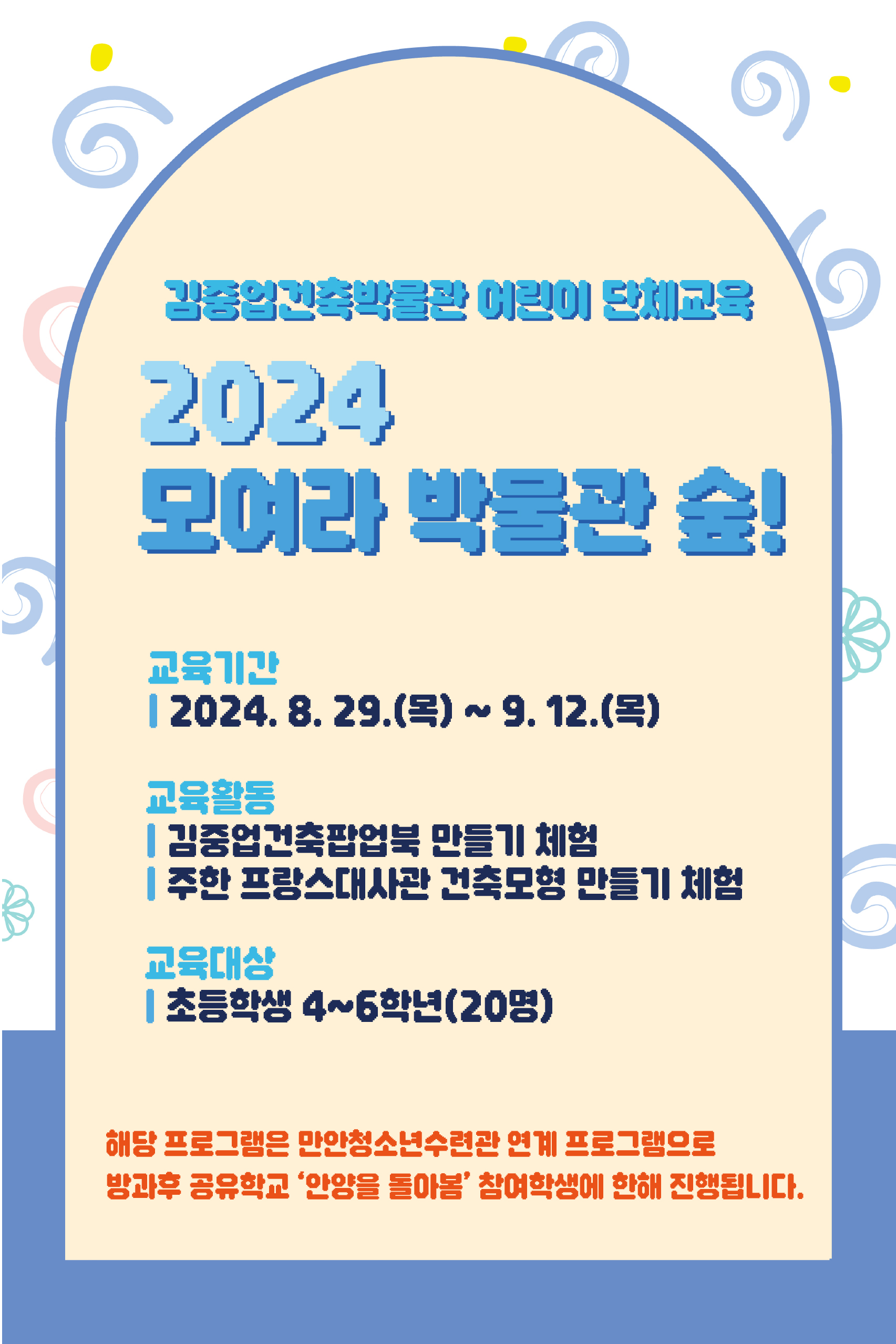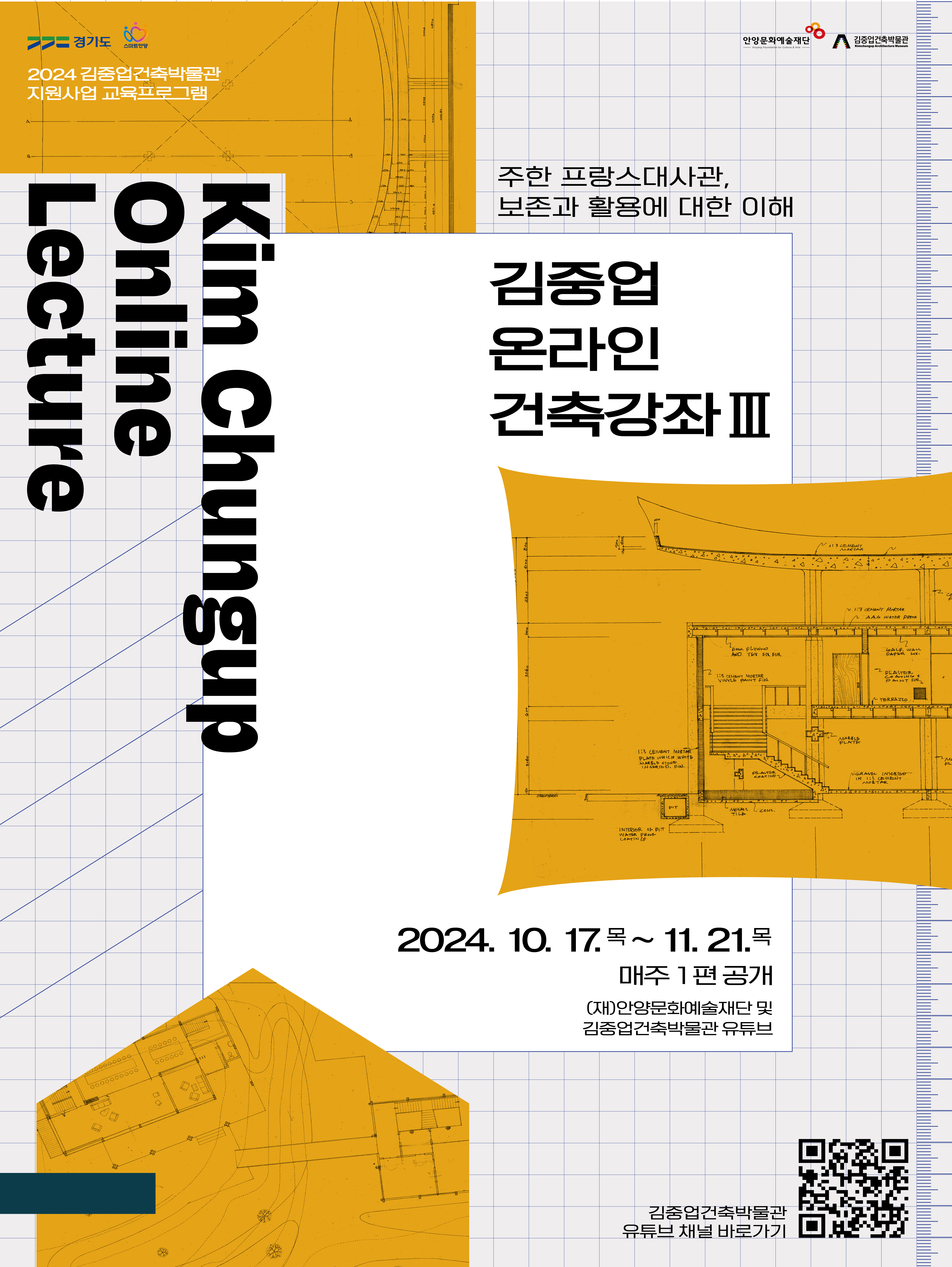 김중업건축박물관은 2024 경기도 박물관/미술관 지원사업의 일환으로 <김중업 온라인 건축강좌Ⅲ>를 운영합니다. <김중업 온라인 건축강좌Ⅲ>는 '주한 프랑스대사관, 보존과 활용에 대한 이해'를 주제로 건축 관련 다양한 전문가들의 담론을 온라인 강좌로 공개하는 교육프로그램입니다. 10월 17일부터 11월 21일까지 매주 목요일 오후 5시 (재)안양문화예술재단과 김중업건축박물관 유튜브에서 강좌를 시청하실 수 있습니다. 김중업건축박물관 유튜브 바로가기(클릭🎬)