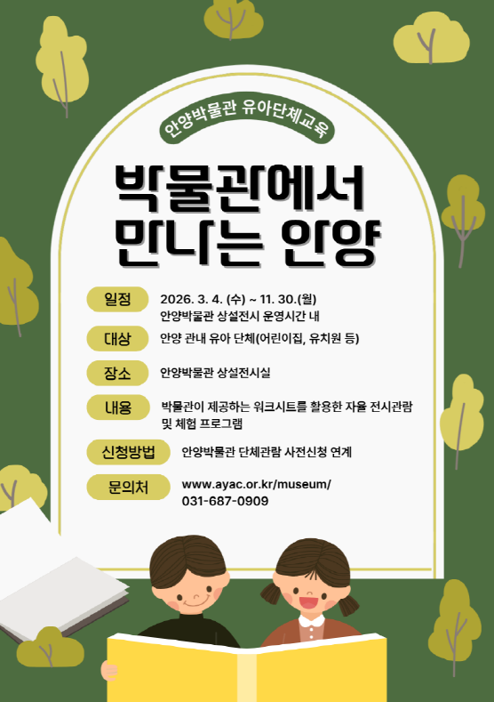 안양박물관과 김중업건축박물관 및 특별전시관을 찾아주시는 여러분들께 감사드립니다. 안양시 박물관 설치 및 운영조례 제6조에 따라2026년 1월 1일(목요일)에 안양박물관과 김중업건축박물관전시실 및 특별전시관이 휴관함을 알려드립니다. 한 해동안 안양박물관과 김중업건축박물관에 많은 관심을 가져주신 여러분들께 감사드리며, 2026년에도 많은 사랑과 관심부탁드립니다. 새해 복 많이 받으세요. 01.01.(목) : 휴관 01.02.(금) : 정상운영 ※ 매주월요일은 휴관입니다.